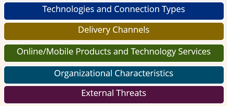 The FFIEC cybersecurity assessment is meant to be completed periodically and after significant technological or operational changes. It is a diagnostic test that helps institutions identify their risk level and determine the maturity of their cybersecurity programs. The FFIEC's Inherent Risk assessment measures risks across the following five categories: